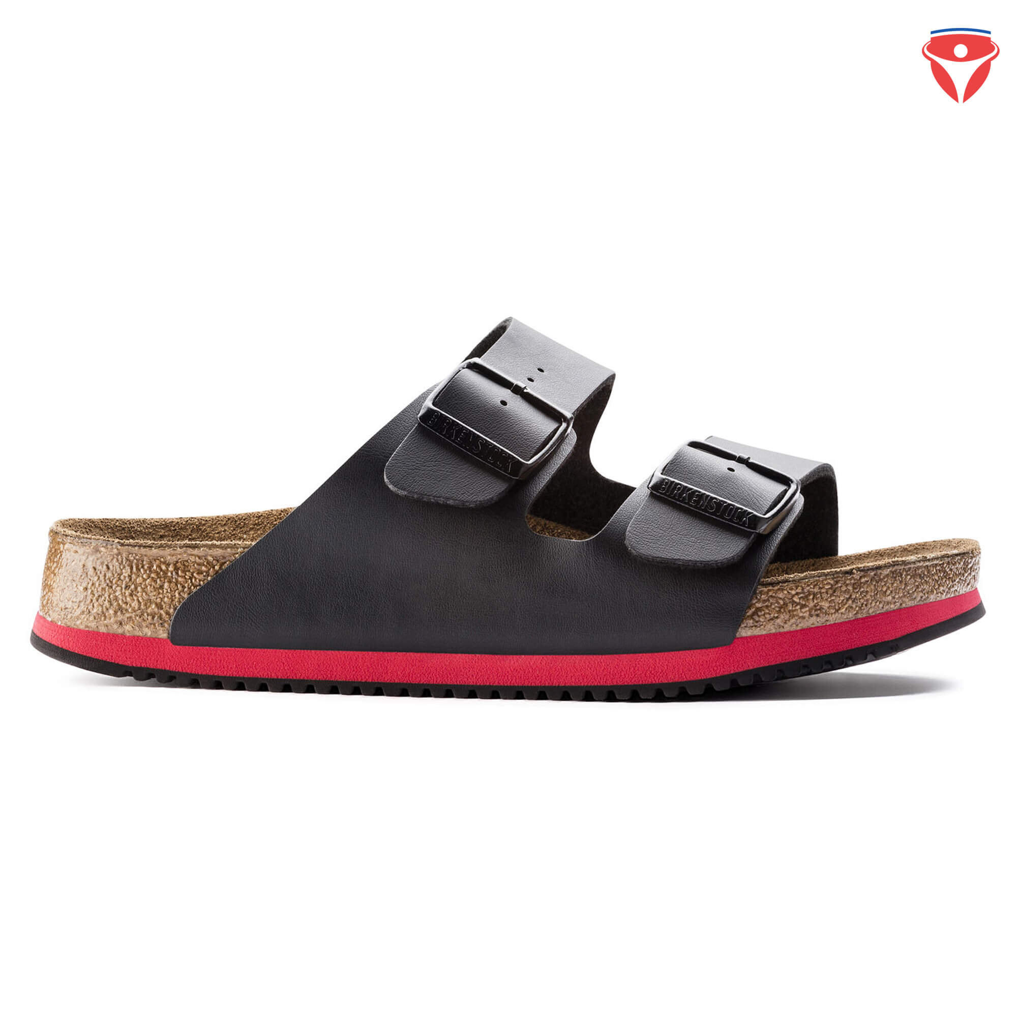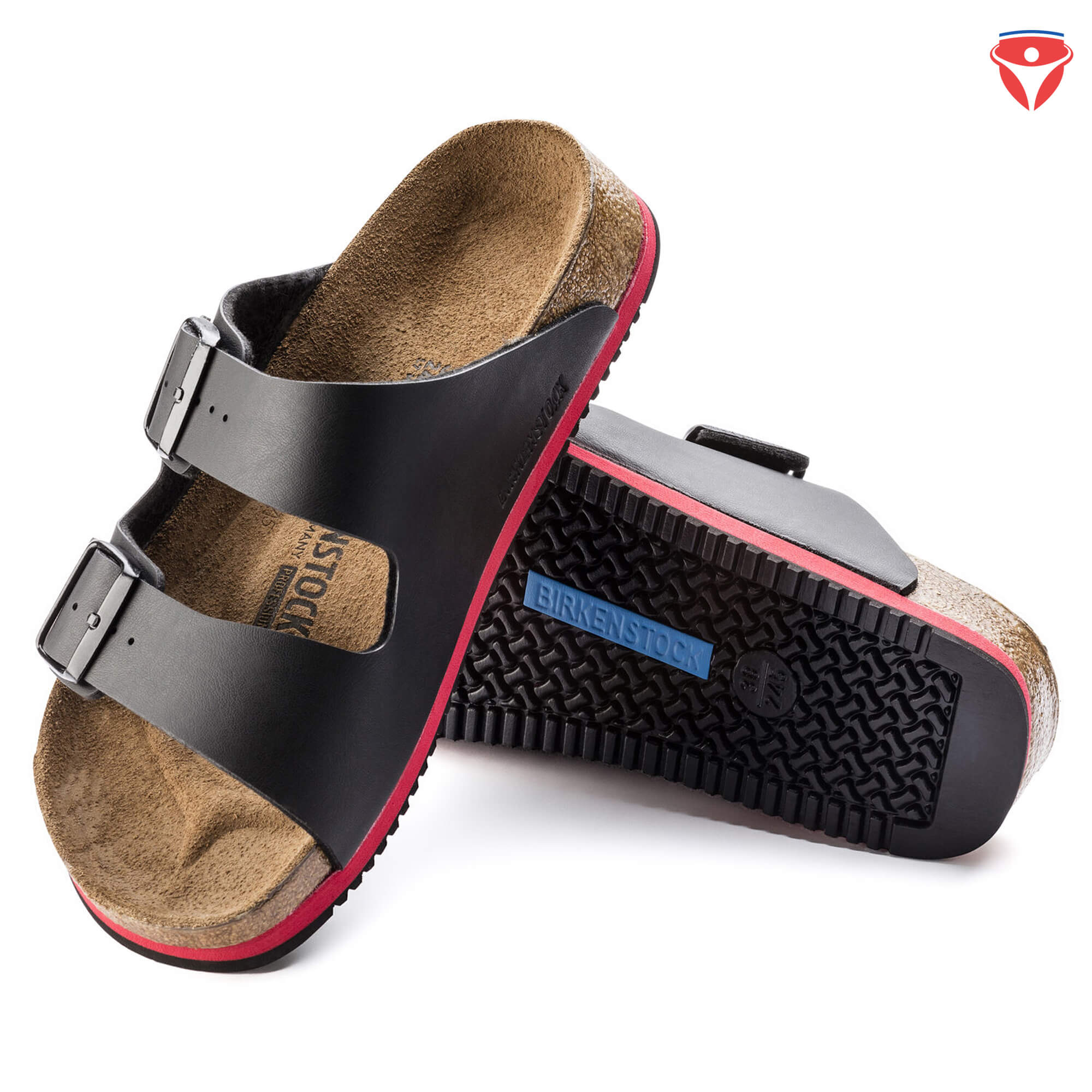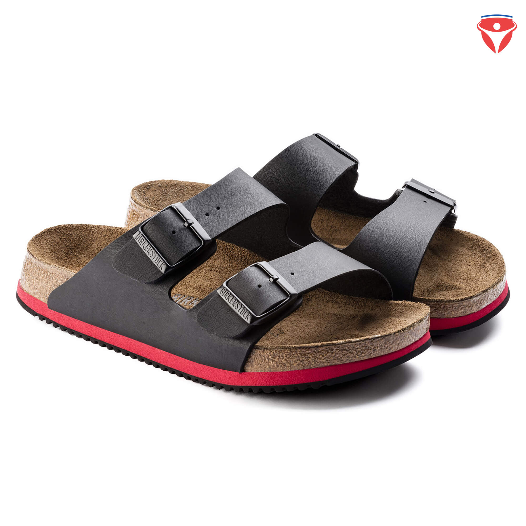 Die bequeme Arizona Sandale von Birkenstock bietet ein Birko-Flor Fussbett und sorgt so für höchsten Tagekomfort auch an langen Arbeitstagen. Die SRA Gummi Laufsohle ist extra rutschhemmend und sorgt so für mehr Sicherheit.