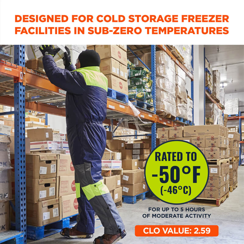 Die Isolationsleistung wird durch CLO-Bewertungen gemessen – eine Einheit für den Wärmewiderstand, die die Isolationsfähigkeit angibt. Je höher der CLO-Wert, desto mehr Wärme spendet ein Kleidungsstück. Zur Bestimmung der Temperaturwerte werden CLO-Faktoren, Metabolic Equivalent of Task (MET) und die Zeit oder Dauer einer Aufgabe berücksichtigt. Die MET-Werte können in leichte Tätigkeiten (Gabelstaplerfahrer, Geräteführer), mittelschwere Tätigkeiten (Kommissionierung und Verpackung, Lieferfahrer) und anstrengende Tätigkeiten (Betonarbeiten, Turmkletterer) eingeteilt werden. Der isolierte Gefrierschutzoverall 6475 von N-Ferno hat eine CLO-Bewertung von 2,59 und ist für eine mäßige Arbeitsbelastung bei Temperaturen von -50 °F/-46 °C für bis zu 5 Stunden (bewertet für einen vollen 8-Stunden-Arbeitstag bei -50 °F/-46 °C) ausgelegt. 45°F // -43°C).
