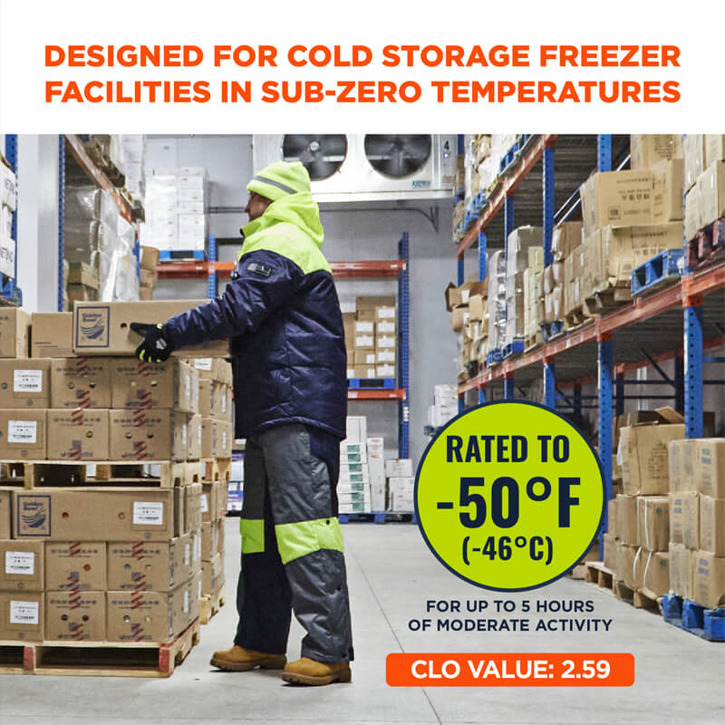 Die Isolationsleistung wird durch CLO-Bewertungen gemessen – eine Einheit für den Wärmewiderstand, die die Isolationsfähigkeit angibt. Je höher der CLO-Wert, desto mehr Wärme spendet ein Kleidungsstück. Zur Bestimmung der Temperaturwerte werden CLO-Faktoren, Metabolic Equivalent of Task (MET) und die Zeit oder Dauer einer Aufgabe berücksichtigt. Die MET-Werte können in leichte Tätigkeiten (Gabelstaplerfahrer, Geräteführer), mittelschwere Tätigkeiten (Kommissionierung und Verpackung, Lieferfahrer) und anstrengende Tätigkeiten (Betonarbeiten, Turmkletterer) eingeteilt werden. Die isolierte Kühljacke N-Ferno 6476 hat eine CLO-Bewertung von 2,59 und ist für eine moderate Arbeitsleistung bei -50 °F // -46 °C Temperaturen für bis zu 5 Stunden ausgelegt (bewertet für einen vollen 8-Stunden-Arbeitstag bei -50 °F // -46 °C). 45°F // -43°C).