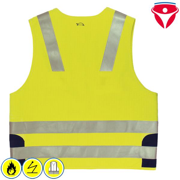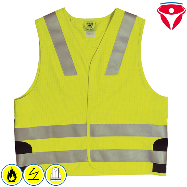 Die flammhemmende, antistatische Warnweste Hi-Vision von HB Schutzbekleidung entspricht der neuen Warnschutznorm EN 20471 und bietet hohe Sichtbarkeit und Flammschutz. Die Warnschutzweste kann über Jacken oder Overalls getragen werden.