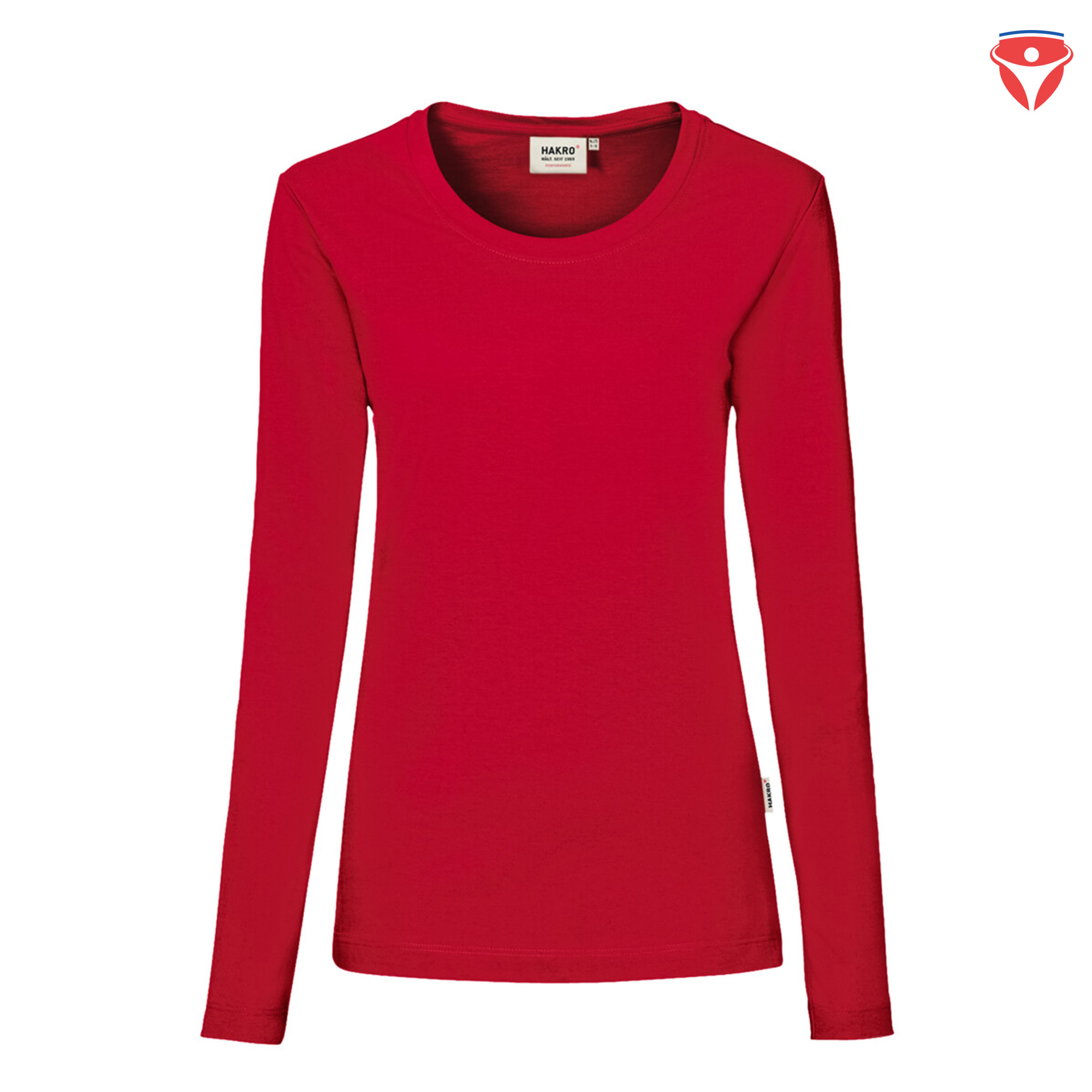 Besonders strapazierfähiges Langarmshirt mit feminin geschnittenem Halsausschnitt, geripptem Halsbündchen und Nackenband. Leasingkoller zur einfachen Kennzeichnung in der gewerblichen Wäscherei und Aufhängebänder im Saum. Hergestellt aus schwerem, besonders pflegeleichtem und funktionellem Single-Jersey aus dem HAKRO Performance-Materialmix Mikralinar®. Gewebtes HAKRO Necklabel aus hochwertigem Kettsatin mit weichen, ultraschallgeschnittenen Bandkanten für höchsten Tragekomfort und gewebtes HAKRO Flaglabel an der linken Seitennaht.
