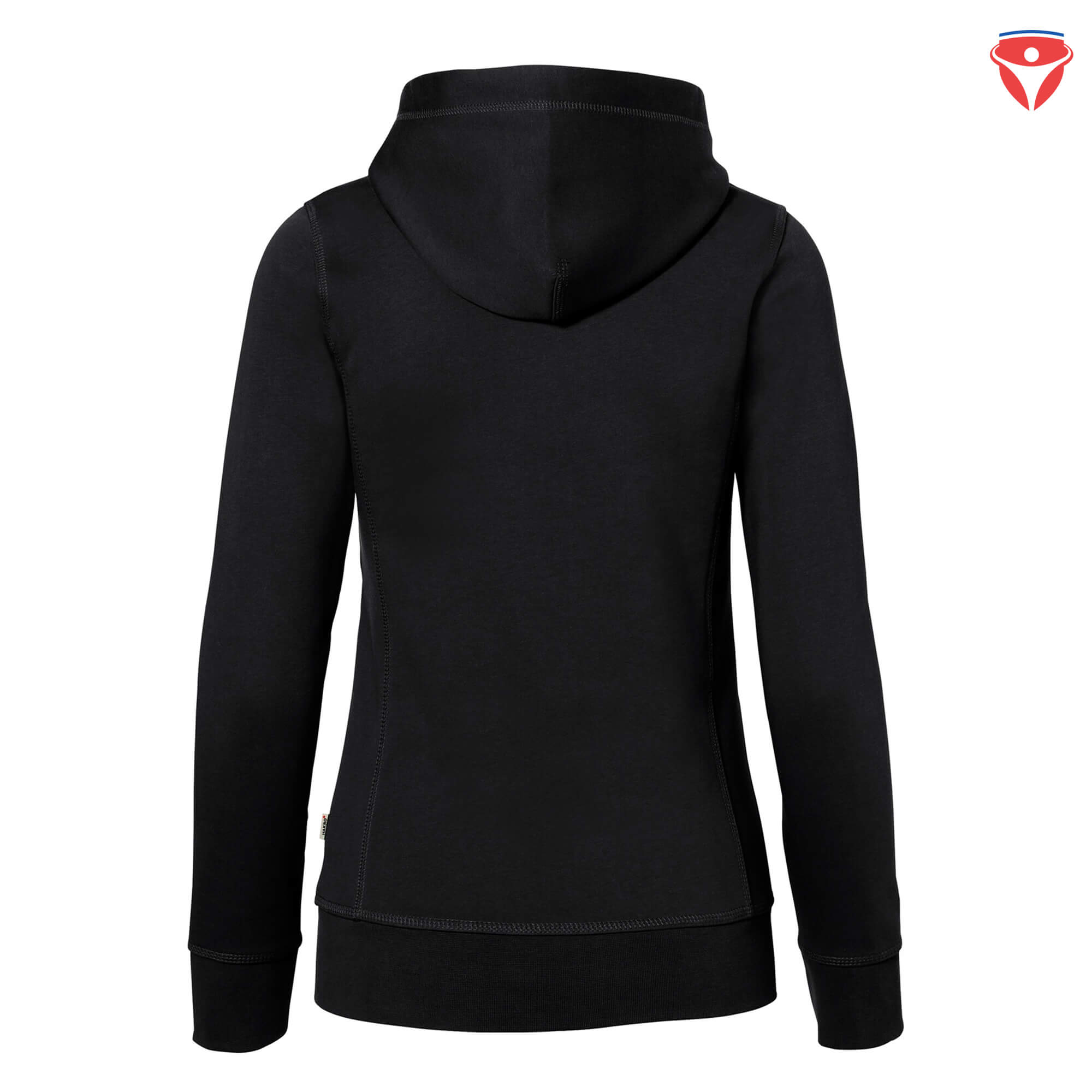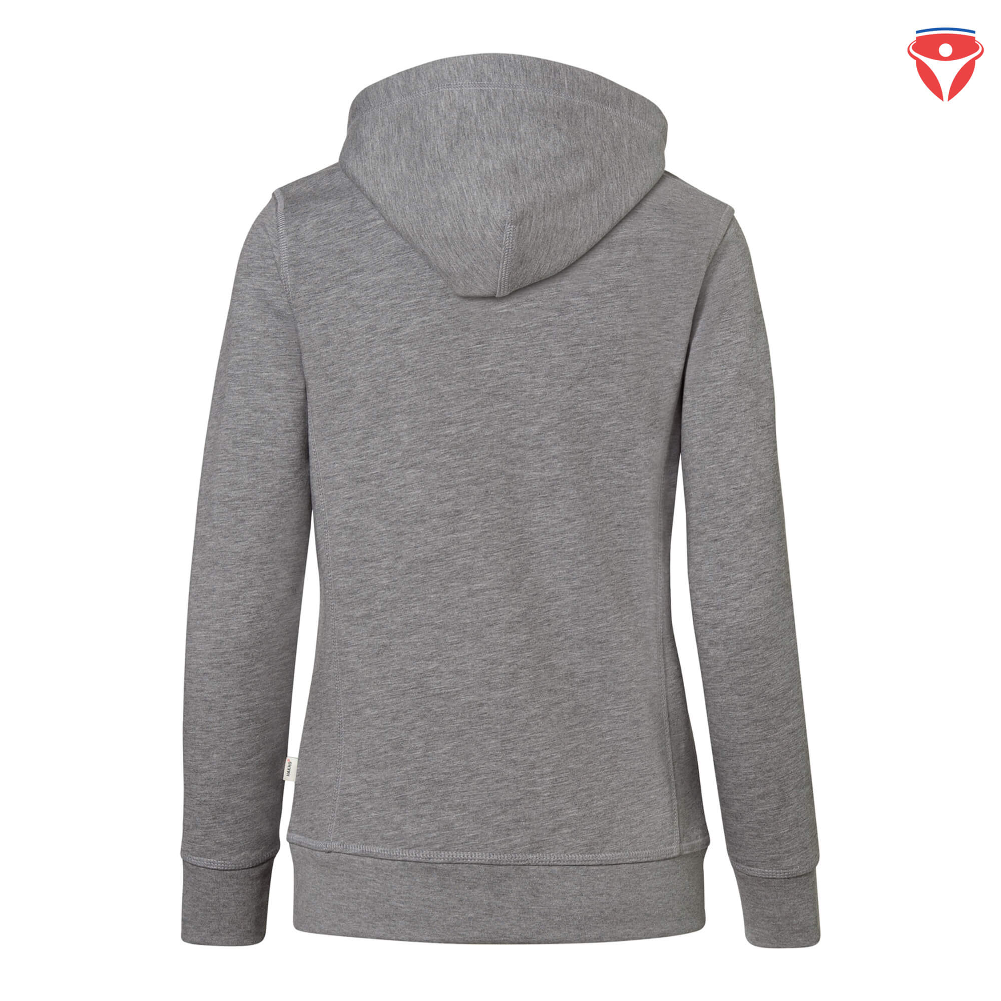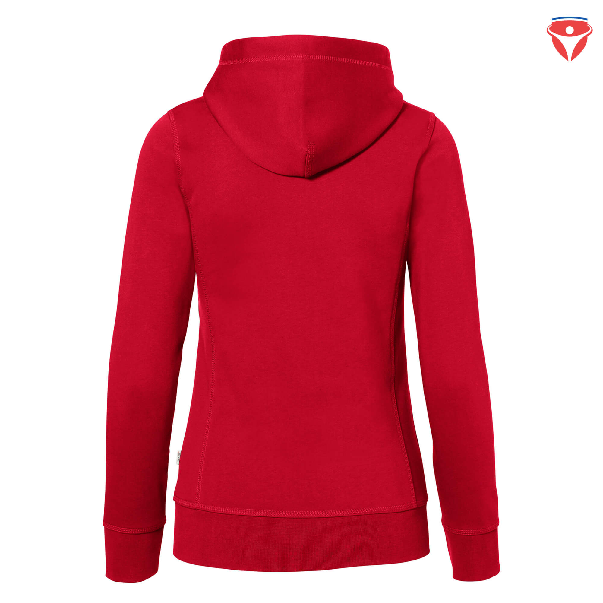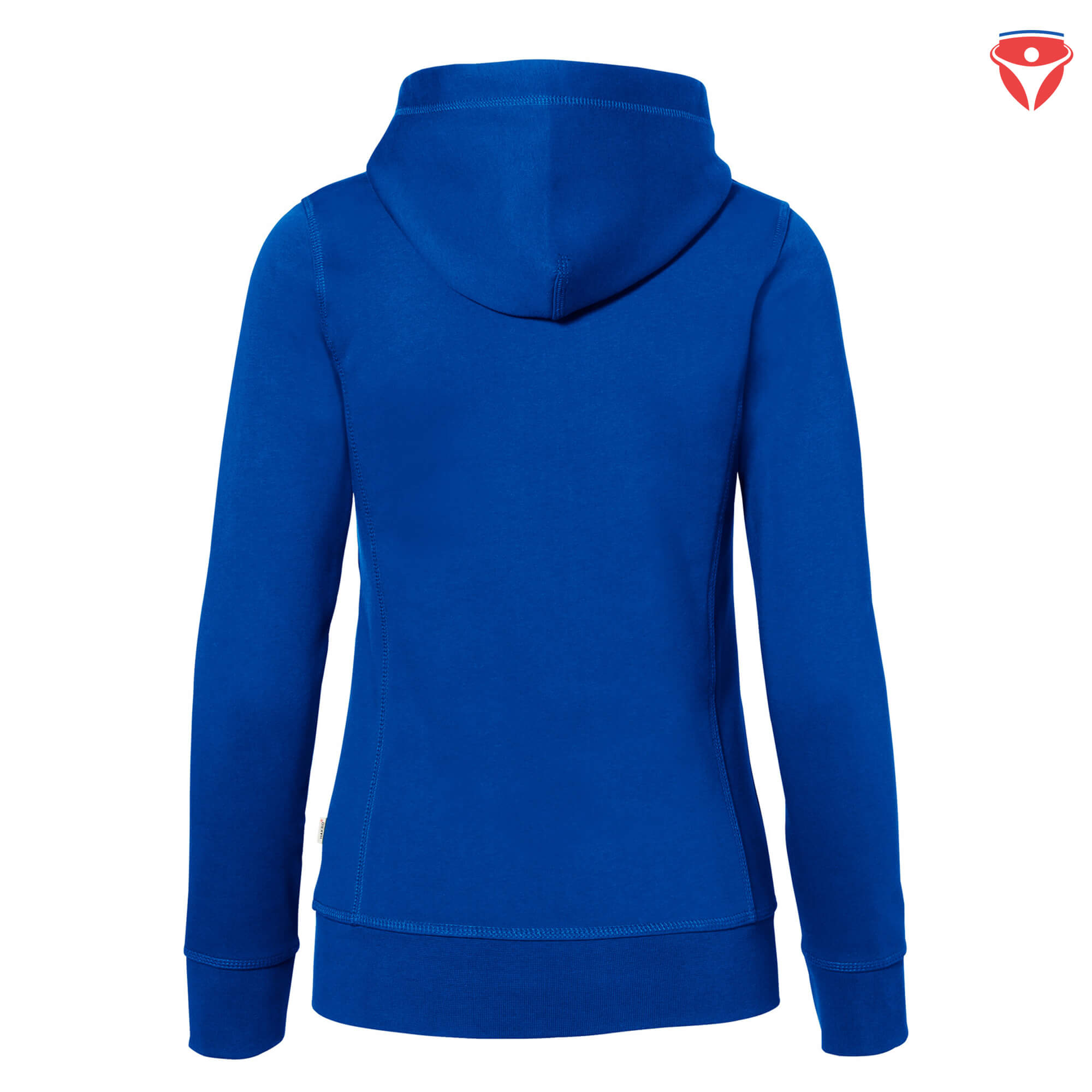 Aufwendig verarbeitete Kapuzenjacke für Damen, mit weichem, kontrastfarbigem Microfleece an der Innenseite, hochwertigem, kontrastfarbigem Frontreißverschluss, hochgeschnittener Kapuze mit kontrastfarbiger Kordel und hochwertigen Metallösen. Alle Reißverschlüsse und Ösen von YKK®. Formstabile Rippstrickbündchen mit LYCRA®-Anteil, Einschubtaschen mit Reißverschlüssen, Teilungsnähte für perfekte Passform mit dekorativer Flatlock-Steppung, kontrastfarbigem Halsspiegel und Nackenband. Hergestellt aus laminiertem 2-Lagen-Material mit einer Außenseite aus feinem Single-Jersey aus langstapeliger, gekämmter und ringgesponnener Baumwolle und einer Innenseite aus weichem Microfleece. Gewebtes HAKRO Necklabel aus hochwertigem Kettsatin mit weichen, ultraschallgeschnittenen Bandkanten für höchsten Tragekomfort und gewebtes HAKRO Flaglabel an der linken Seitennaht.