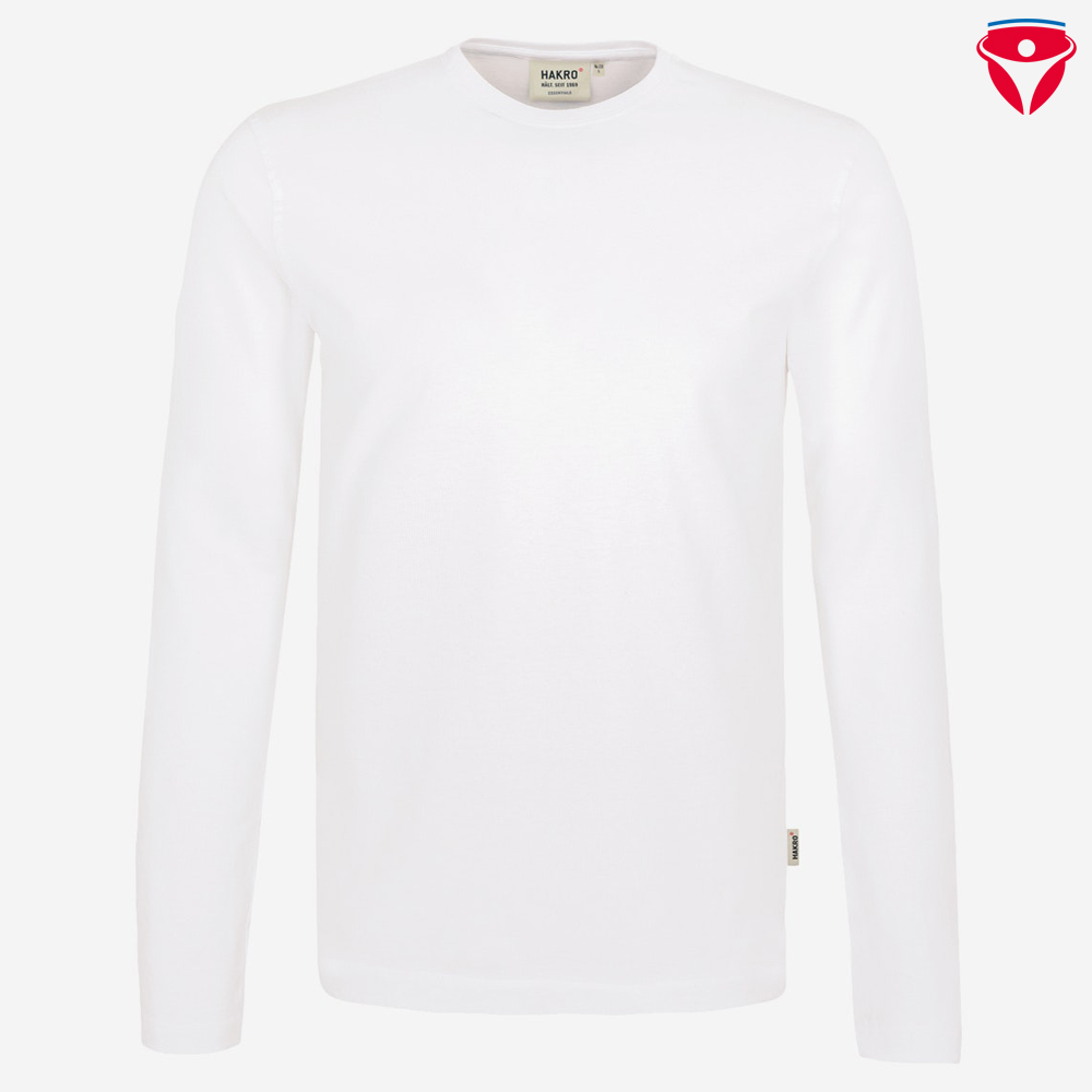 Klassisches Langarmshirt mit rundem Halsausschnitt, modisch schmalem, mit LYCRA®-verstärktem Halsbündchen und Nackenband. Hergestellt aus schwerem Single-Jersey aus langstapeliger, gekämmter und ringgesponnener Baumwolle. Gewebtes Necklabel aus hochwertigem Kettsatin mit weichen, ultraschallgeschnittenen Bandkanten für höchsten Tragekomfort und gewebtes HAKRO-Flaglabel an der linken Seitennaht.