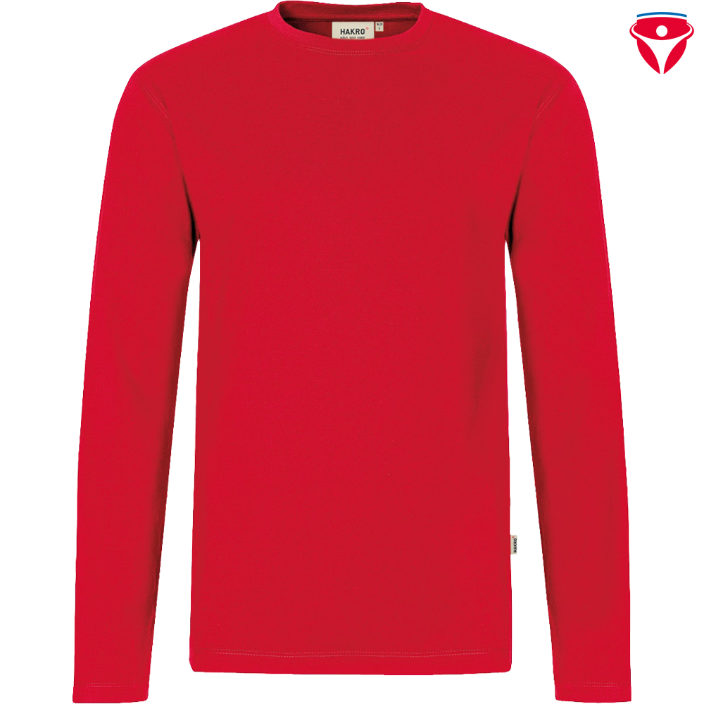 Besonders strapazierfähiges Langarmshirt mit rundem Halsausschnitt, geripptem Halsbündchen und Nackenband. Leasingkoller zur einfachen Kennzeichnung in der gewerblichen Wäscherei und Aufhängebänder im Saum. Hergestellt aus schwerem, besonders pflegeleichtem und funktionellem Single-Jersey aus dem Performance-Materialmix MikraLinar®. Gewebtes Hakro-Necklabel aus hochwertigem Kettsatin mit weichen, ultraschallgeschnittenen Bandkanten für höchsten Tragekomfort und gewebtes HAKRO-Flaglabel an der linken Seitennaht.