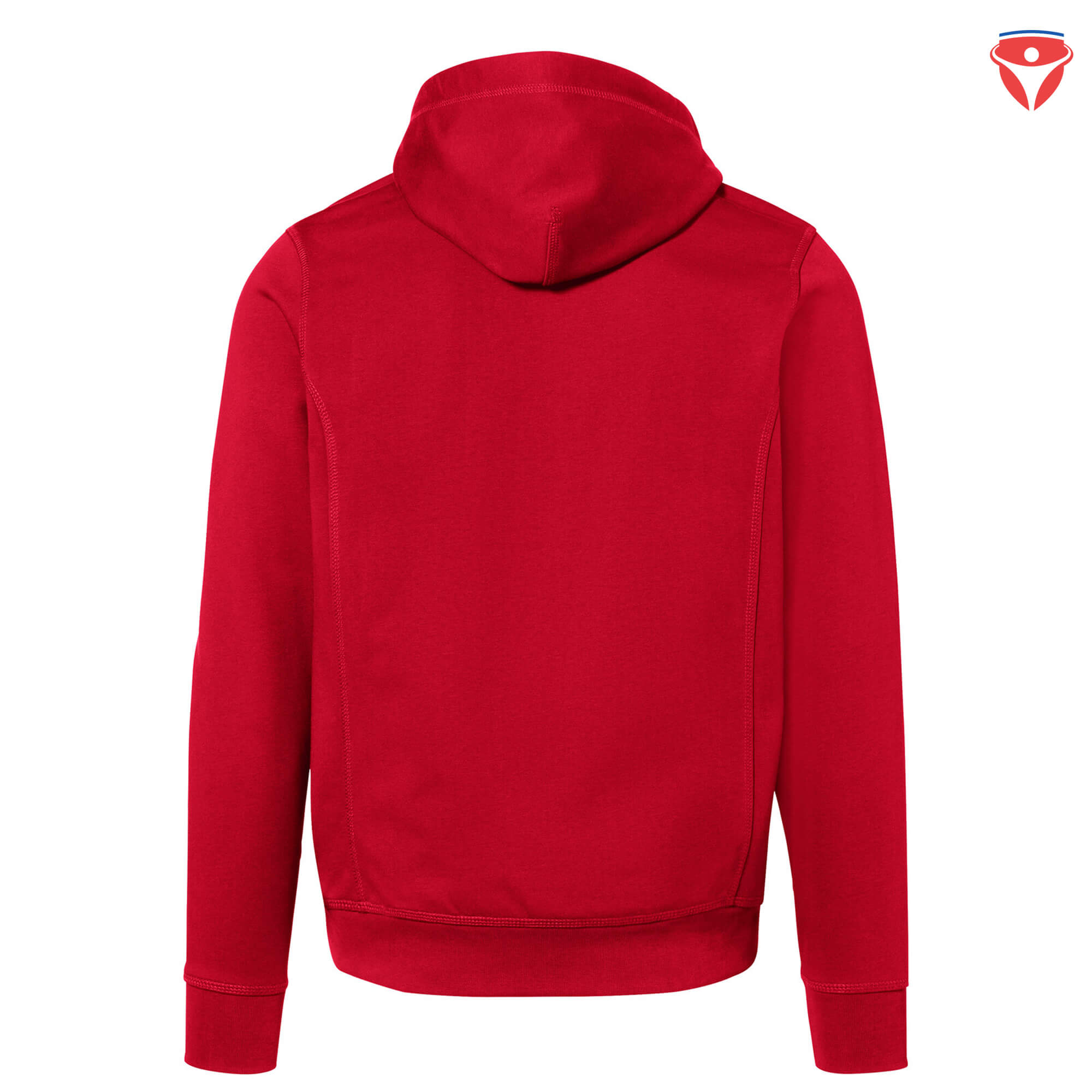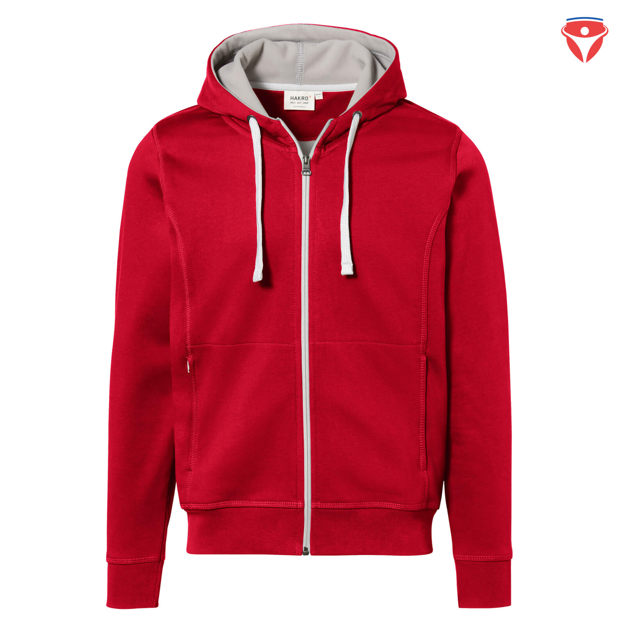 Aufwendig verarbeitete Kapuzenjacke für Herren, mit weichem, kontrastfarbigem Microfleece an der Innenseite, hochwertigem, kontrastfarbigem Frontreißverschluss, hochgeschnittener Kapuze mit kontrastfarbiger Kordel und hochwertigen Metallösen. Alle Reißverschlüsse und Ösen von YKK®. Formstabile Rippstrickbündchen mit LYCRA®-Anteil, Einschubtaschen mit Reißverschlüssen, Teilungsnähte für perfekte Passform mit dekorativer Flatlock-Steppung, kontrastfarbigem Halsspiegel und Nackenband. Hergestellt aus laminiertem 2-Lagen-Material mit einer Außenseite aus feinem Single-Jersey aus langstapeliger, gekämmter und ringgesponnener Baumwolle und einer Innenseite aus weichem Microfleece. Gewebtes HAKRO Necklabel aus hochwertigem Kettsatin mit weichen, ultraschallgeschnittenen Bandkanten für höchsten Tragekomfort und gewebtes HAKRO Flaglabel an der linken Seitennaht.