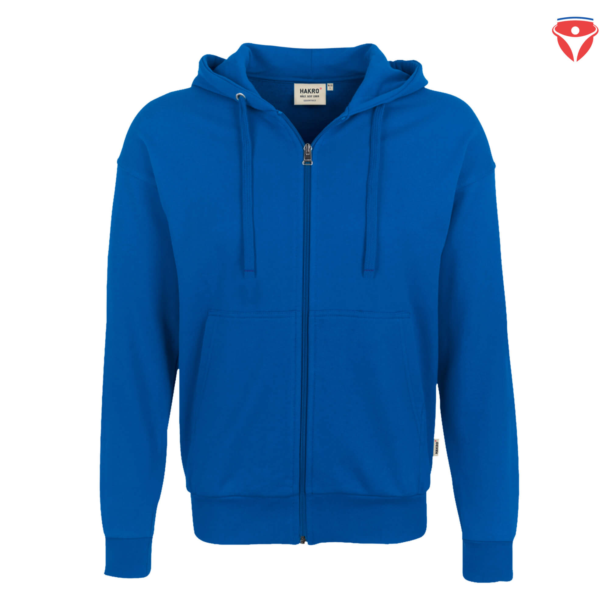 Sportive Kapuzen-Sweatjacke mit hochwertigem Reißverschluss von YKK®, gefütterter Kapuze mit Kordel und hochwertigen Metallösen von YKK®, formstabilen Rippstrickbündchen mit LYCRA®-Anteil, nicht angerauter Innenseite (French-Terry), Einschubtaschen und Nackenband. Hergestellt aus pflegeleichter Baumwolle-Polyester-Mischung für höchste Ansprüche. Gewebtes HAKRO Necklabel aus hochwertigem Kettsatin mit weichen, ultraschallgeschnittenen Bandkanten für höchsten Tragekomfort und gewebtes HAKRO Flaglabel an der linken Seitennaht.