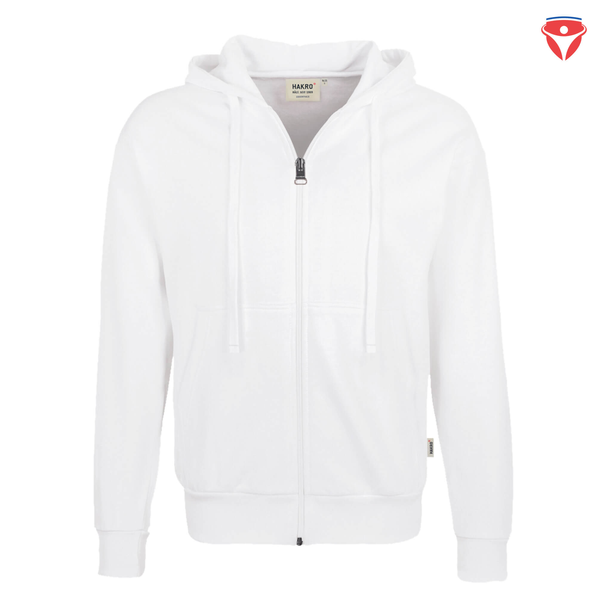 Sportive Kapuzen-Sweatjacke mit hochwertigem Reißverschluss von YKK®, gefütterter Kapuze mit Kordel und hochwertigen Metallösen von YKK®, formstabilen Rippstrickbündchen mit LYCRA®-Anteil, nicht angerauter Innenseite (French-Terry), Einschubtaschen und Nackenband. Hergestellt aus pflegeleichter Baumwolle-Polyester-Mischung für höchste Ansprüche. Gewebtes HAKRO Necklabel aus hochwertigem Kettsatin mit weichen, ultraschallgeschnittenen Bandkanten für höchsten Tragekomfort und gewebtes HAKRO Flaglabel an der linken Seitennaht.
