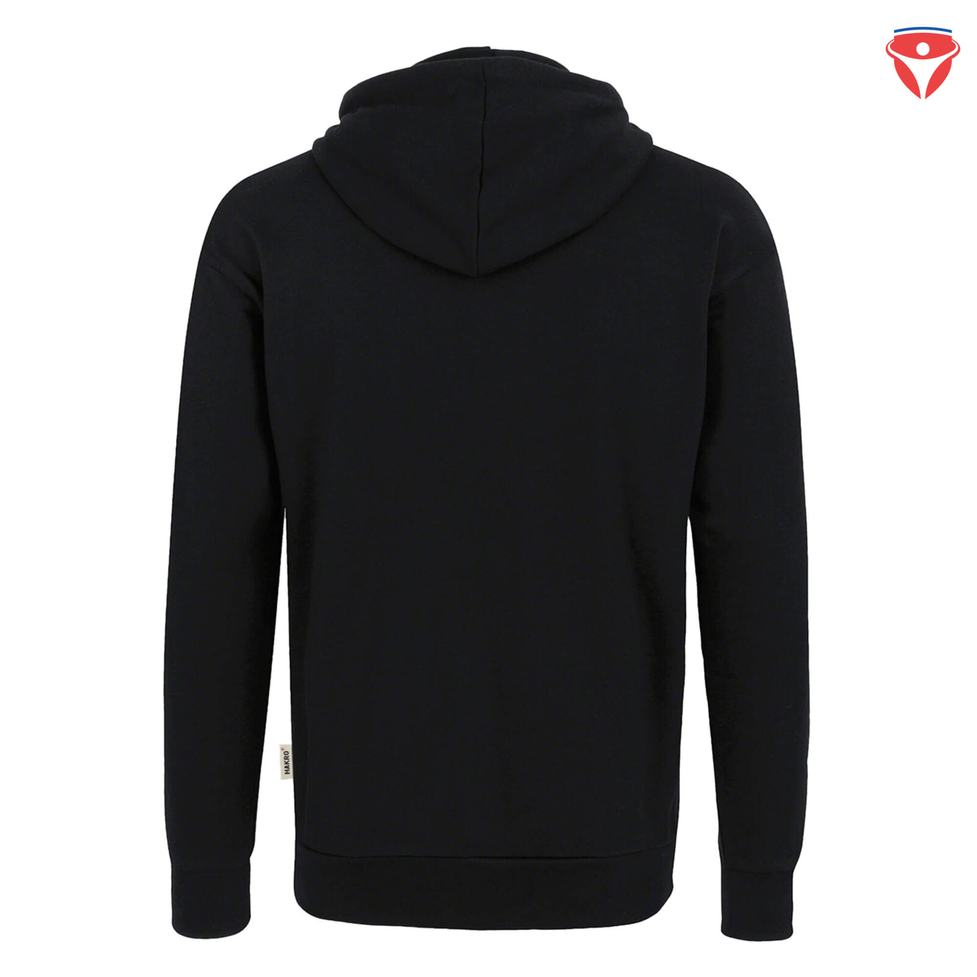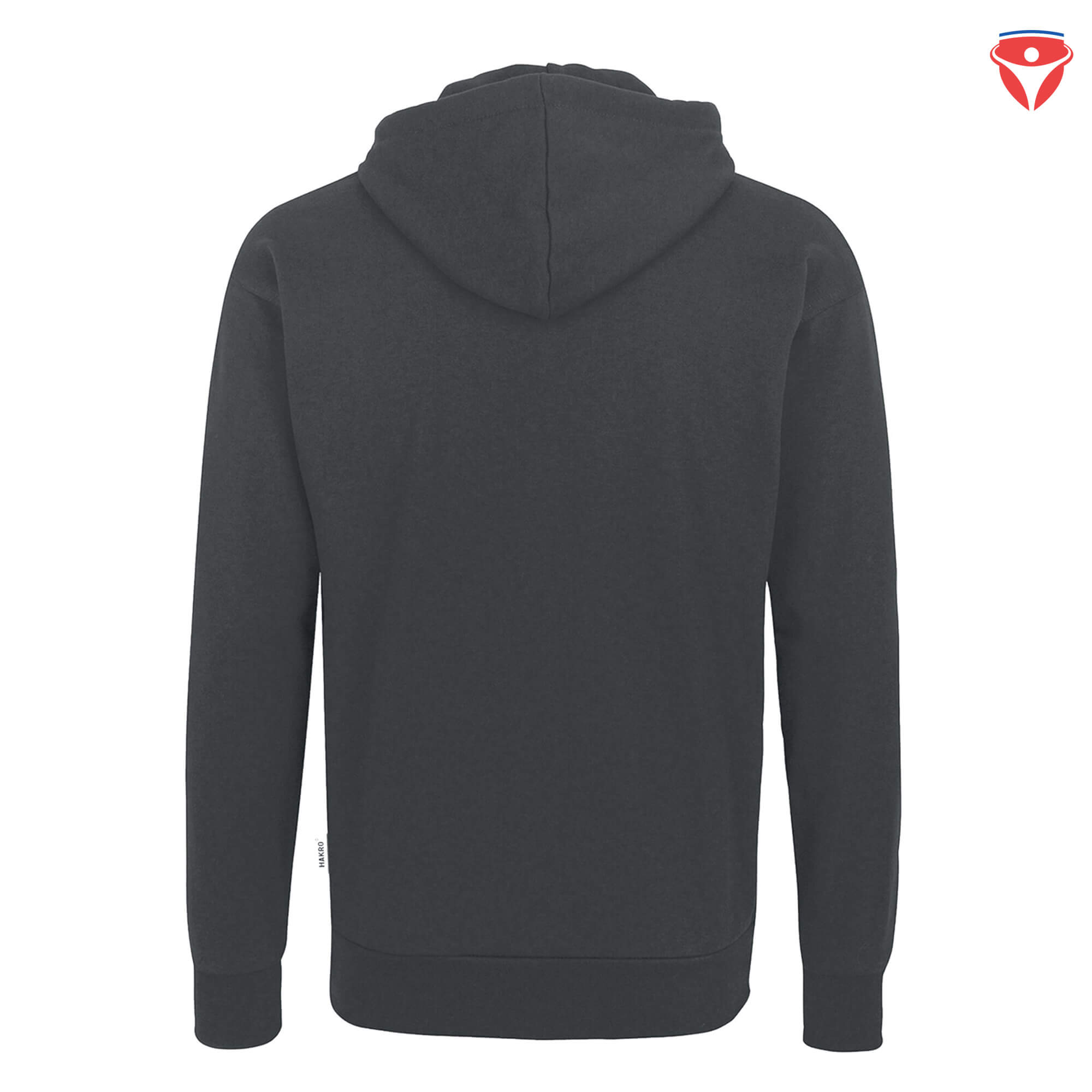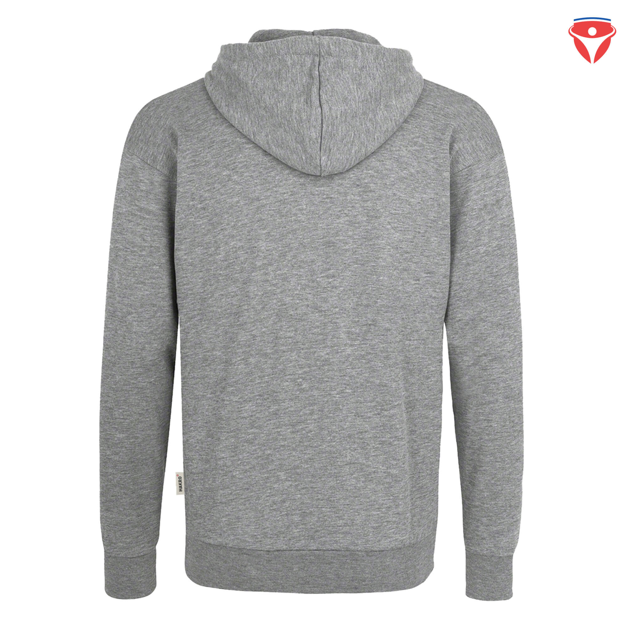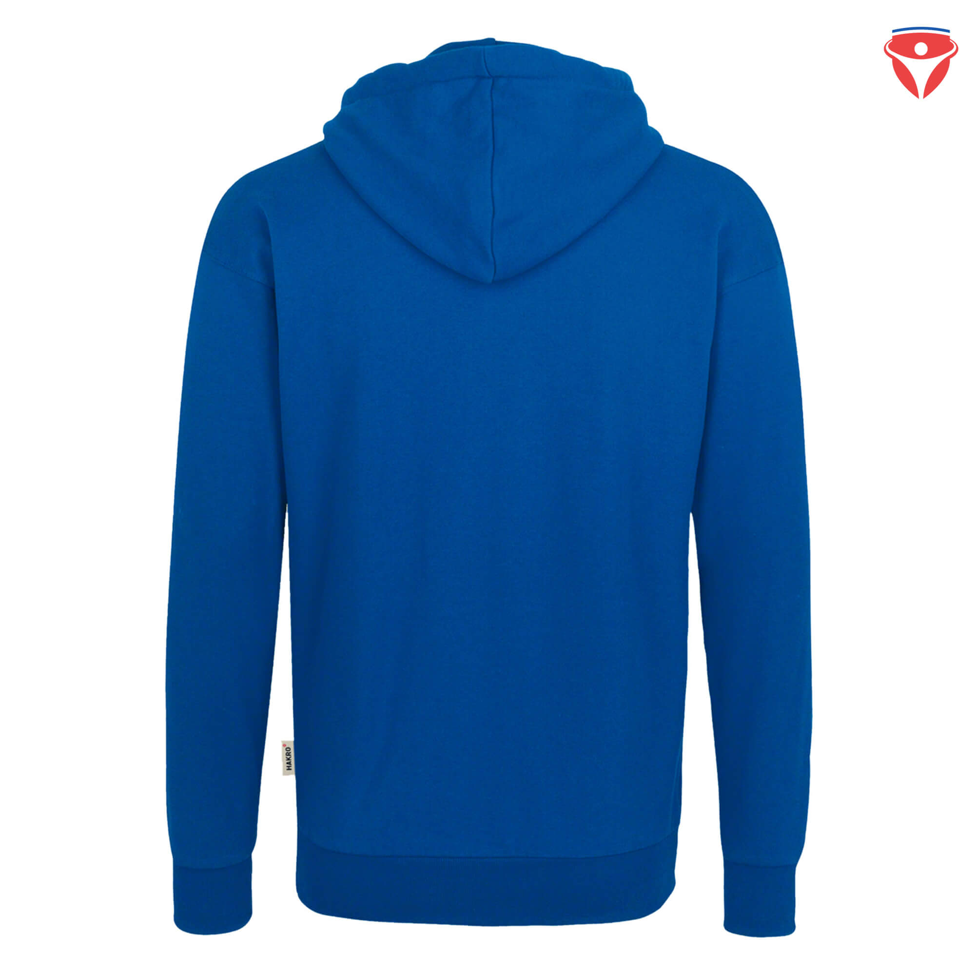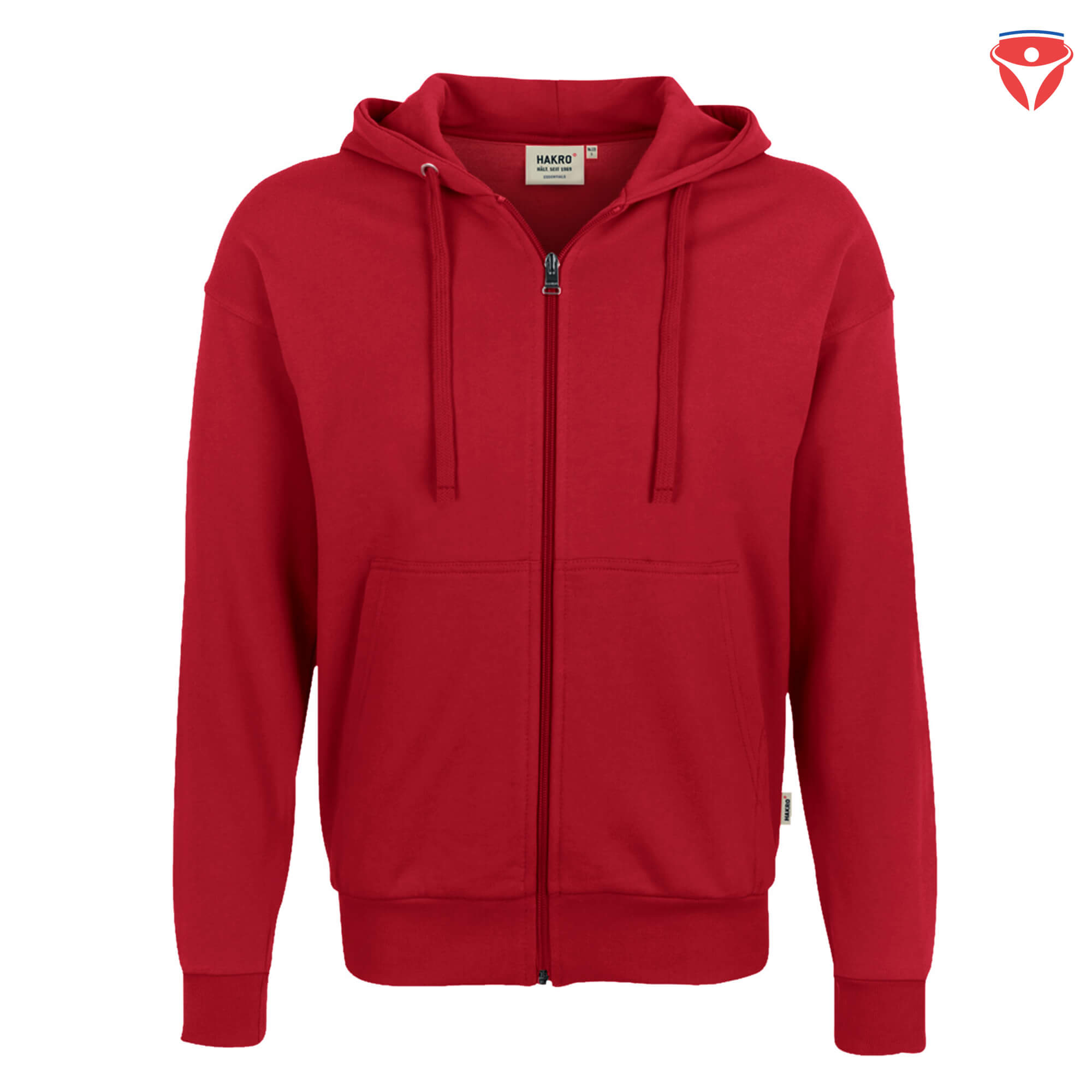 Sportive Kapuzen-Sweatjacke mit hochwertigem Reißverschluss von YKK®, gefütterter Kapuze mit Kordel und hochwertigen Metallösen von YKK®, formstabilen Rippstrickbündchen mit LYCRA®-Anteil, nicht angerauter Innenseite (French-Terry), Einschubtaschen und Nackenband. Hergestellt aus pflegeleichter Baumwolle-Polyester-Mischung für höchste Ansprüche. Gewebtes HAKRO Necklabel aus hochwertigem Kettsatin mit weichen, ultraschallgeschnittenen Bandkanten für höchsten Tragekomfort und gewebtes HAKRO Flaglabel an der linken Seitennaht.