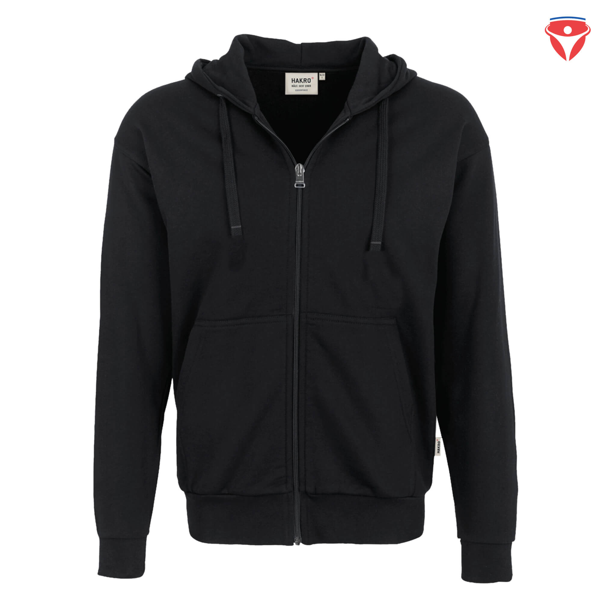 Sportive Kapuzen-Sweatjacke mit hochwertigem Reißverschluss von YKK®, gefütterter Kapuze mit Kordel und hochwertigen Metallösen von YKK®, formstabilen Rippstrickbündchen mit LYCRA®-Anteil, nicht angerauter Innenseite (French-Terry), Einschubtaschen und Nackenband. Hergestellt aus pflegeleichter Baumwolle-Polyester-Mischung für höchste Ansprüche. Gewebtes HAKRO Necklabel aus hochwertigem Kettsatin mit weichen, ultraschallgeschnittenen Bandkanten für höchsten Tragekomfort und gewebtes HAKRO Flaglabel an der linken Seitennaht.