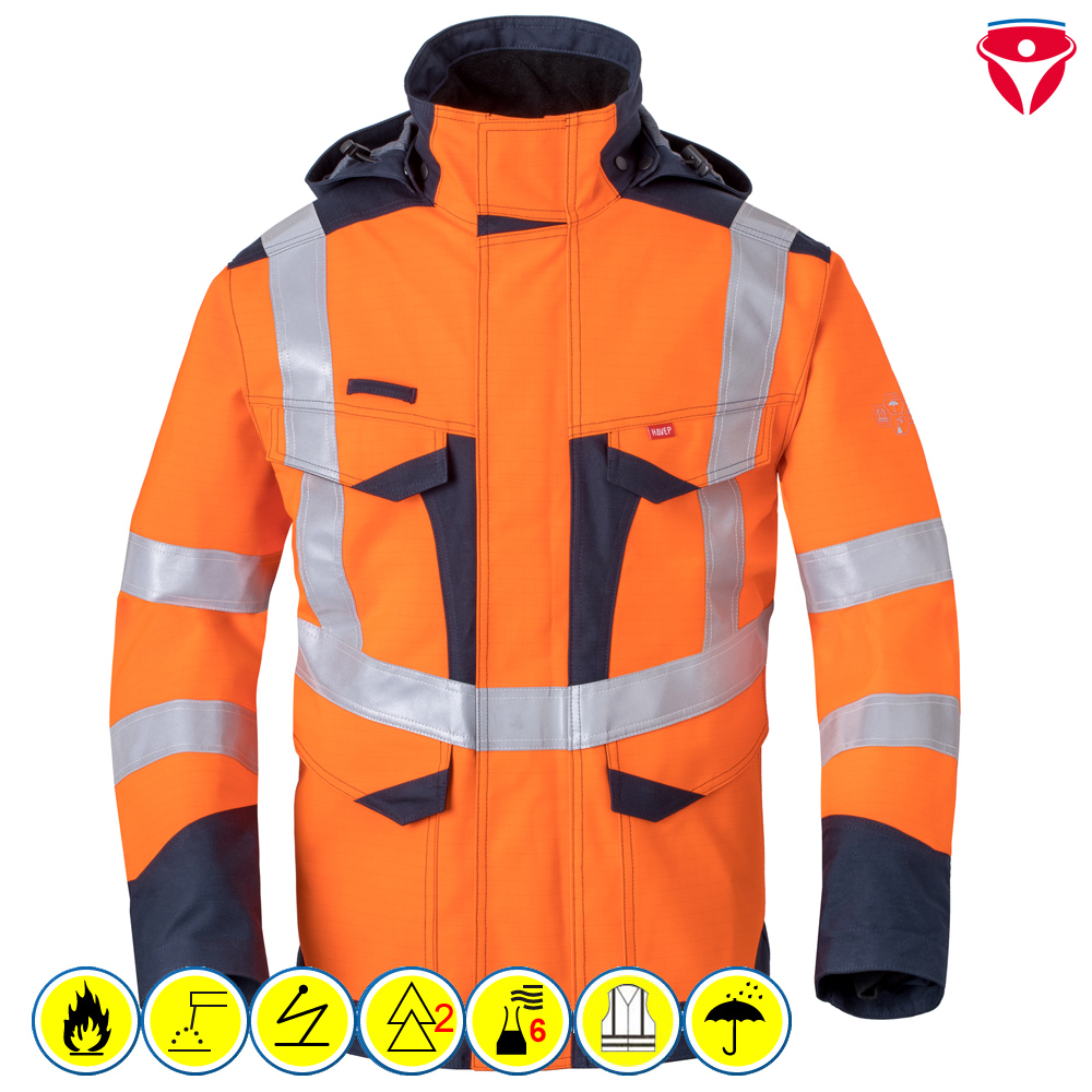 | Schutz vor: | Hitze, Flammen, Schweissen, Antistatik, Chemikalien, Störlichtbogen 1 | 4 kA, Störlichtbogen 2 | 7 kA, Warnschutz, Regenschutz, Windschutz |