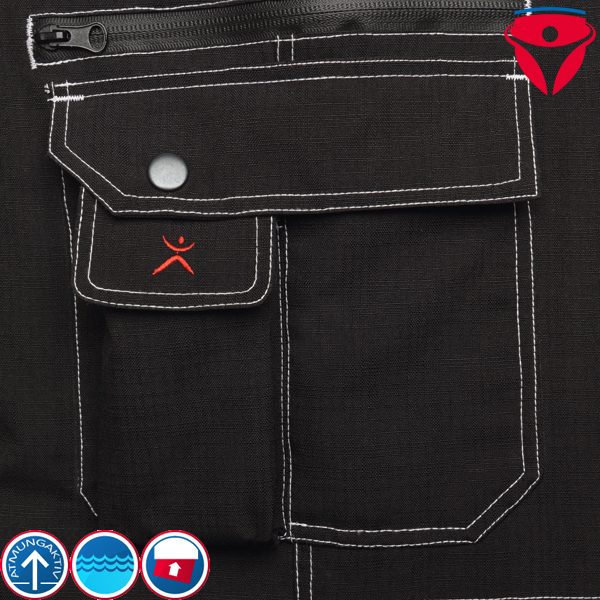 - doppelte Oberschenkeltasche links mit wasserdichtem Reissverschluss und Patte mit Druckknopf