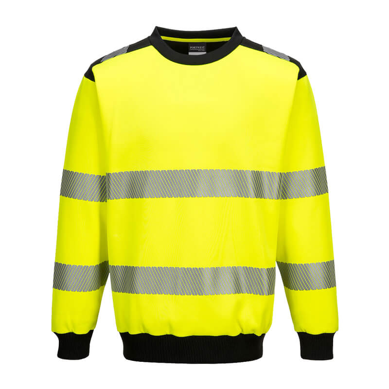 Das PW3 Hi-Vis Rundhals-Sweatshirt zeichnet sich durch sein unverwechselbares Design aus, und kombiniert Portwest HiVisTex Pro Reflexband mit modernen Kontrastpaneelen.