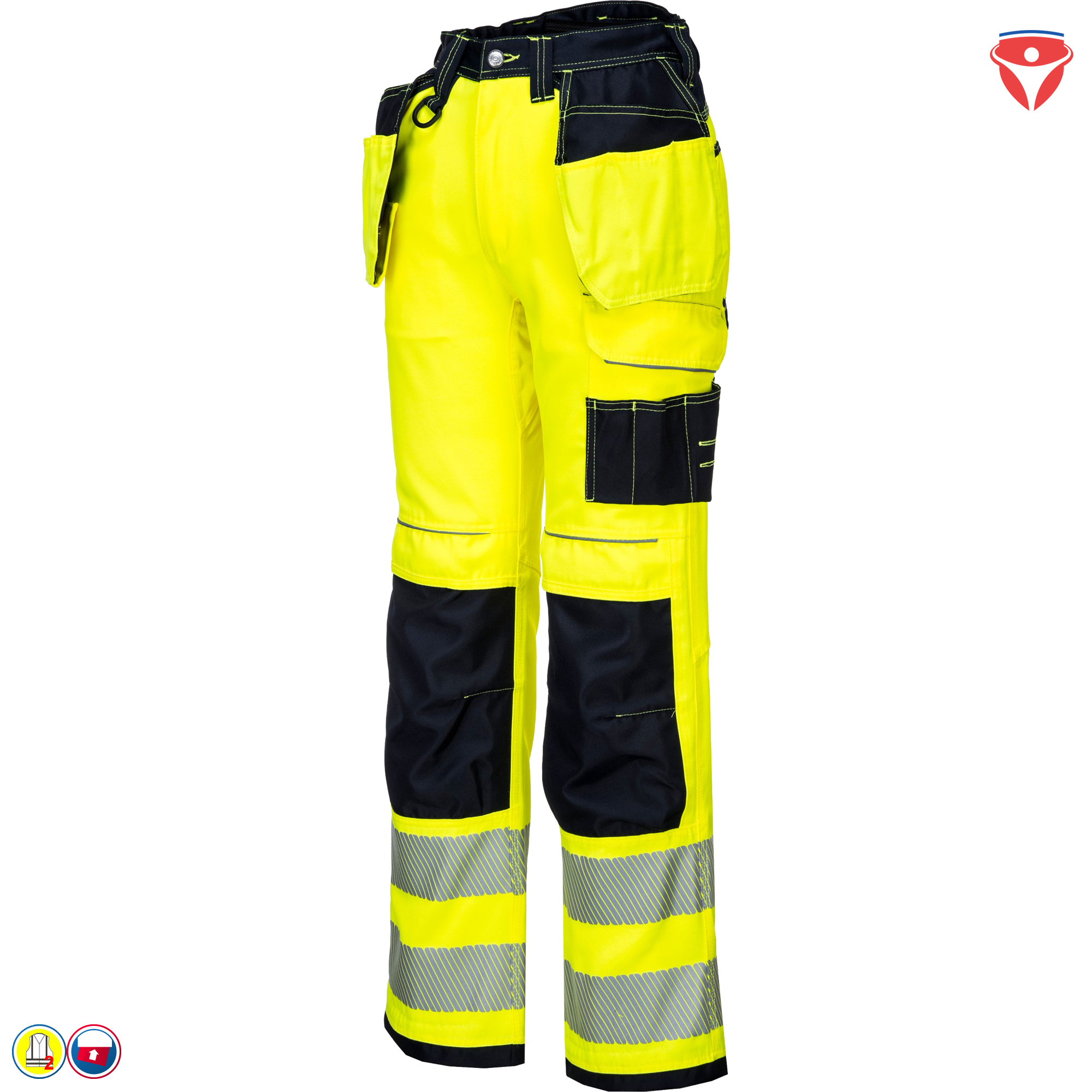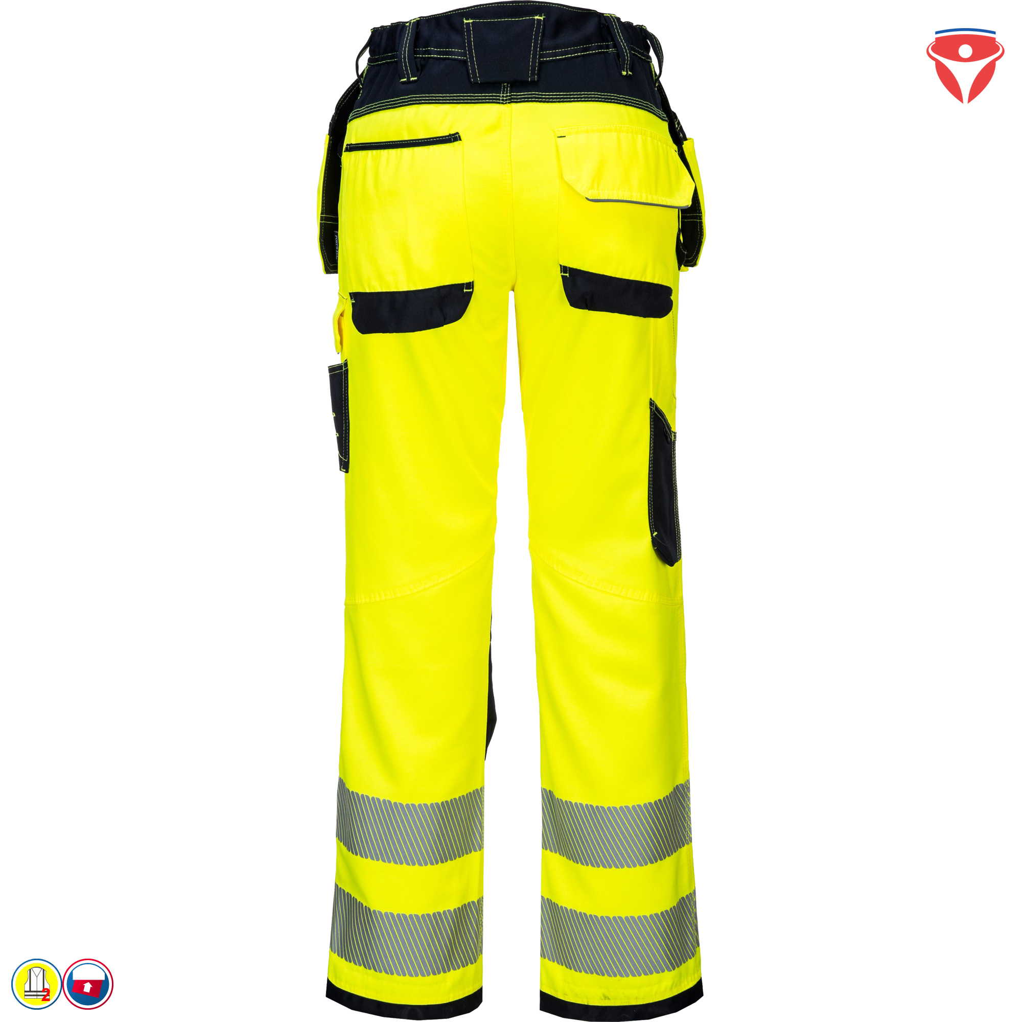 Eine durchdachte, innovative PortWest Warnschutzhose mit multifunktionalen Holstertaschen, Knieschpolstertaschen und bequemen Zugriff auf mehrere Oberschenkeltaschen für die sichere Aufbewahrung von Mobiltelefon, Schlüsseln und Werkzeug. Oxford Gewebeverstärkung an den Belastungspunkten und dreifache Nähte garantieren maximale Haltbarkeit.
