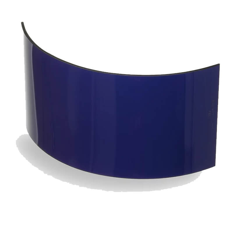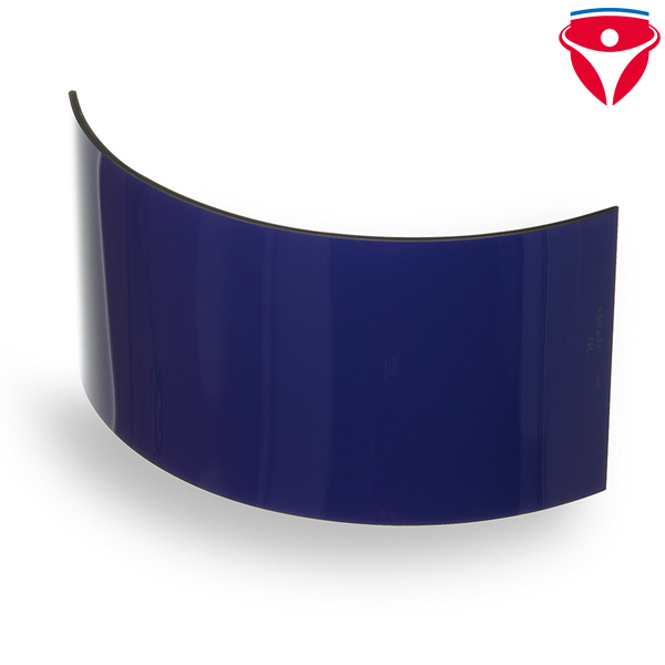 Das gebogene Tempex Ofenschauglas ist dunkelblau und bietet zusammen mit der Kopfschutzhaube höchsten Schutz gegen Strahlungshitze.